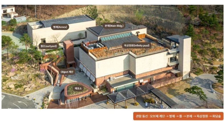 화담채는 사랑채의 의미로 본건물인 본채와 미디어아트관인 ‘별채’를 매끄럽게 연결시켜주는 ‘오브제 계단‘과, ‘뜰, 그리고 ‘옥상정원’으로 되어있습니다.